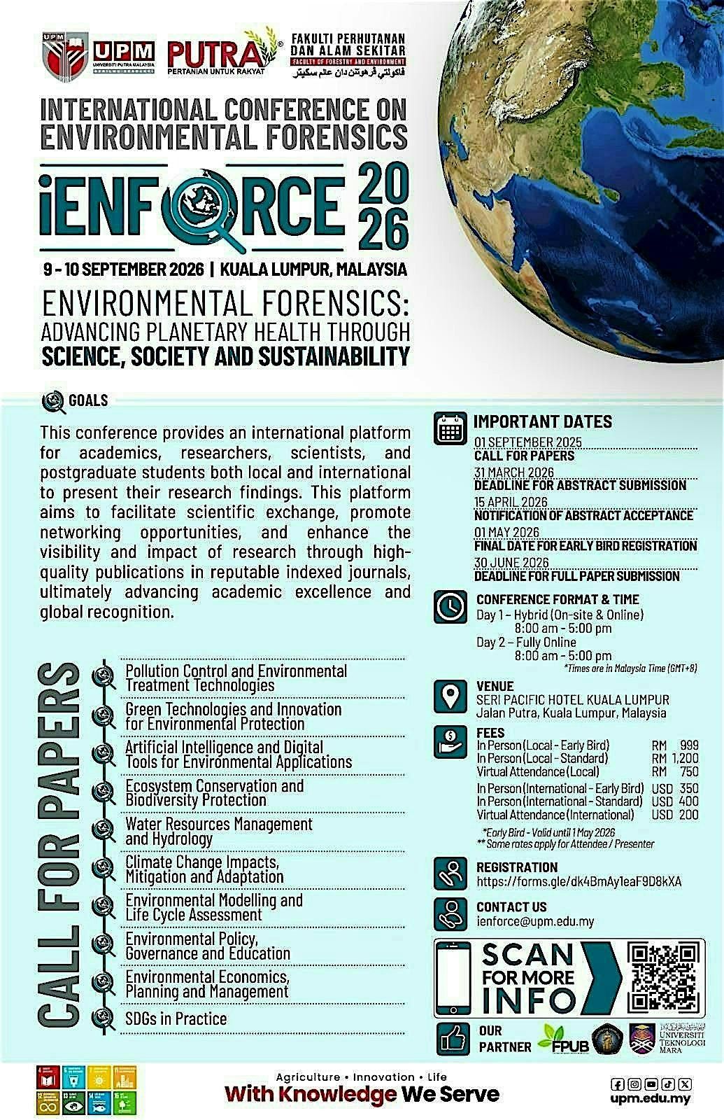 iENFORCE2026 will broaden its scope by inviting paper submissions from researchers across various disciplines, not only in the core field of environmental forensics but also encompassing applied sciences and social sciences. This interdisciplinary approach aims to foster a more holistic exchange of ideas, thereby enriching discussions and innovation in addressing environmental issues. In support of this, iENFORCE2026 will feature the following sub-themes: Pollution Control and Environmental Treatment Technologies, Green Technologies and Innovation for Environmental Protection, Artificial Intelligence and Digital Tools for Environmental Applications, Ecosystem Conservation and Biodiversity Protection, Water Resources Management and Hydrology, Climate Change Impacts, Mitigation, and Adaptation, Environmental Modelling and Life Cycle Assessment, Environmental Policy, Governance, and Education, Environmental Economics, Planning, and Management, SDGs in Practice. Confenrence website: https://ienforce2026.upm.edu.my/home