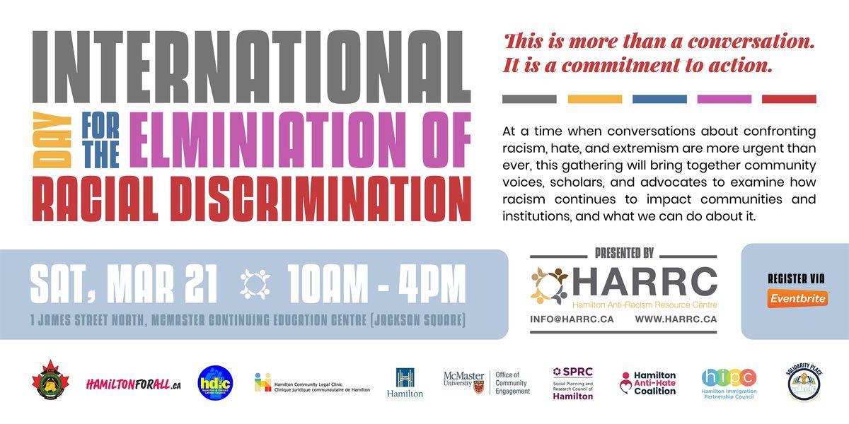 On Saturday, March 21st, HARRC invites community members, students, practitioners, researchers, and advocates to come together in recognition of the International Day for the Elimination of Racial Discrimination. This full-day gathering will create space to examine racism, discrimination, and hate in Hamilton through research insights, lived experiences, and community dialogue. Together, we will reflect, learn, and explore meaningful pathways forward.