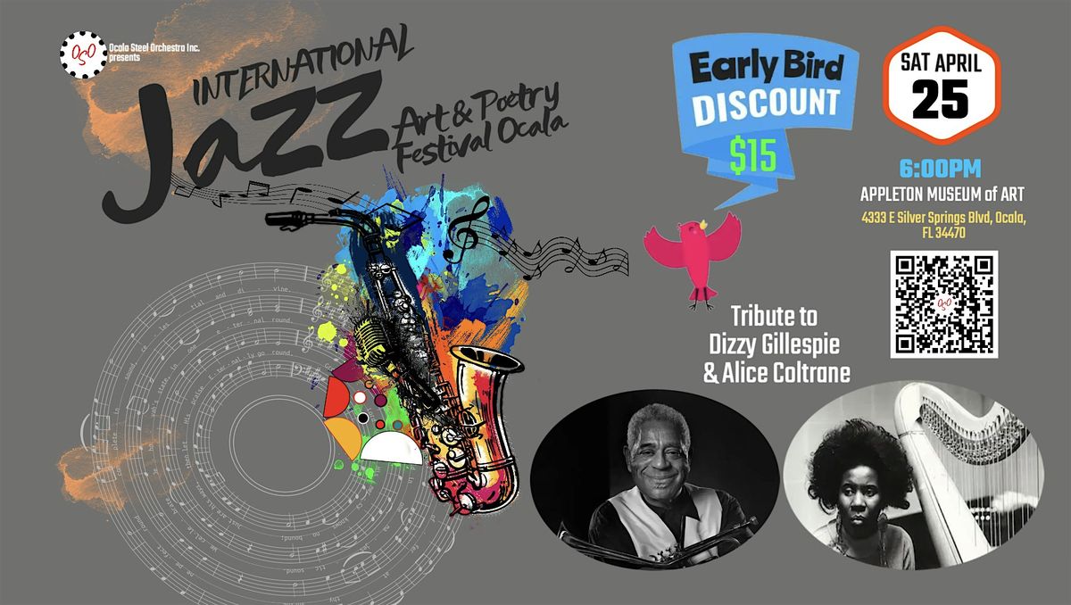 Welcome to the International Jazz, Art & Poetry Festival Ocala – Tribute to Dizzy Gillespie & Alice Coltrane! The fourth installment of OSO’s International Jazz, Art & Poetry Festival will honor two of America’s greatest jazz icons, Dizzy Gillespie & Alice Coltrane. This event marks the first fundraising effort in 2026 by Ocala Steel Orchestra, a 501(c)(3) organization. Funds raised from the events will support our ongoing mission to provide free music literacy, acquire new instruments, and sustain our programs at St Matthews Lutheran Church, 3453 E Silver Springs Blvd, Ocala, FL 34470. Visit OSO's website for further details about IJAPFO here: www.ocalasteelorchestra.org