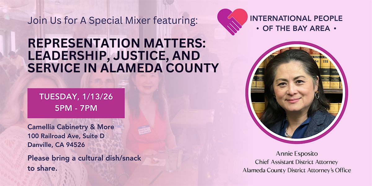 Meet global friends and vibes at the International People of the Bay Area's Mixer with Chief Assistant District Attorney, Annie Esposito!About this Event