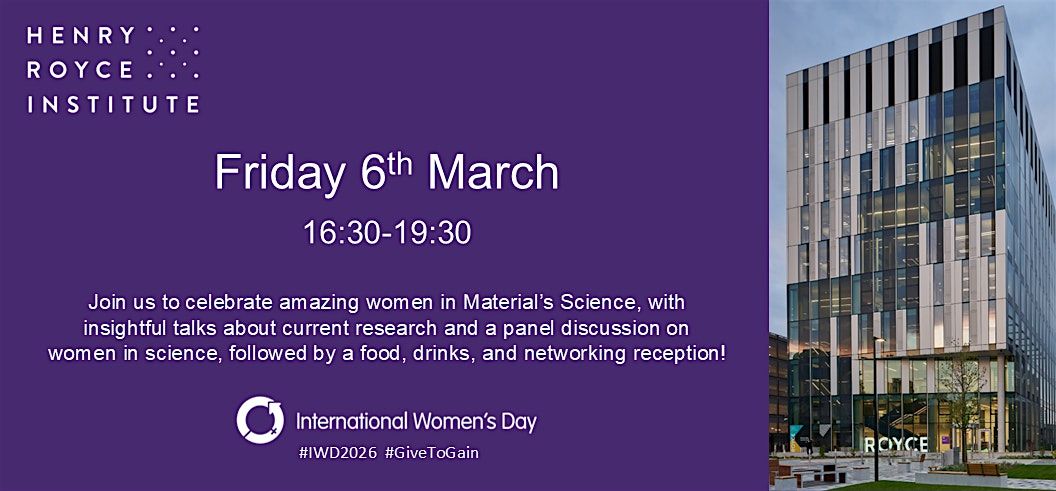 Royce is hosting an evening to celebrate this year's International Women's Day by showcasing some of the fantastic work being done by researchers and technical staff at the University of Manchester, a keynote talk from award-winning Professor Emily Draper based at the Univesity of Glasgow, and a panel discussion focusing on "women in science". This will be followed by an nibbles and refreshments and a chance to join the discussion. We welcome anyone and everyone to join, no matter your background or gender!