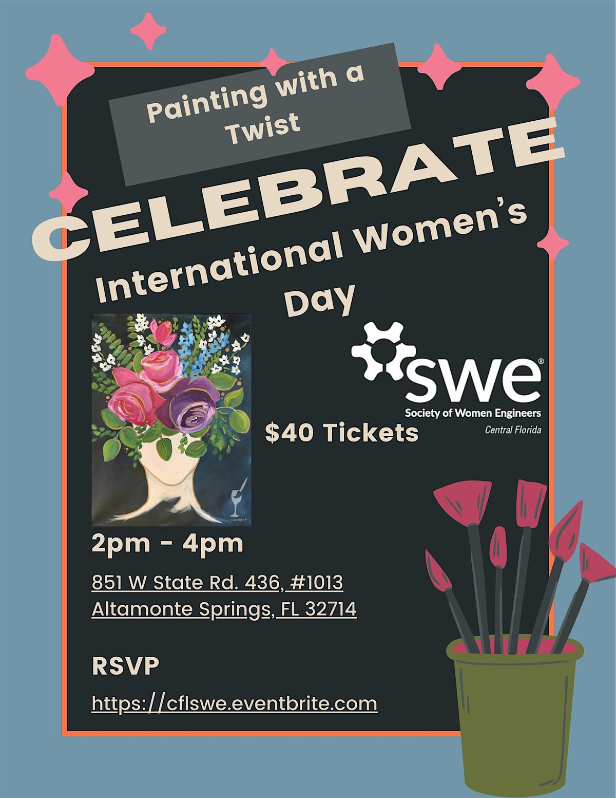 Please RSVP Through our Eventbrite to let us know you are coming! Please make sure you also register with our group on the Painting with a Twist's Website.
