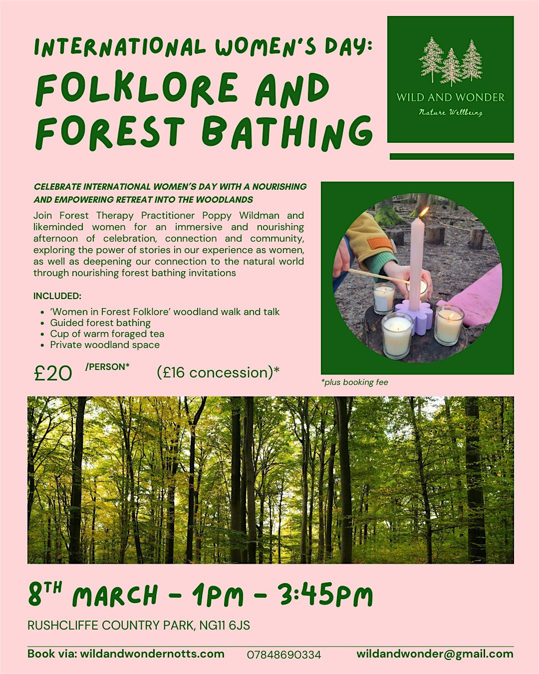 Join us in private woodlands at Rushcliffe Country Park on International Women's Day to celebrate and empower each other as women through the medium of 'Folklore and Forest Bathing'.