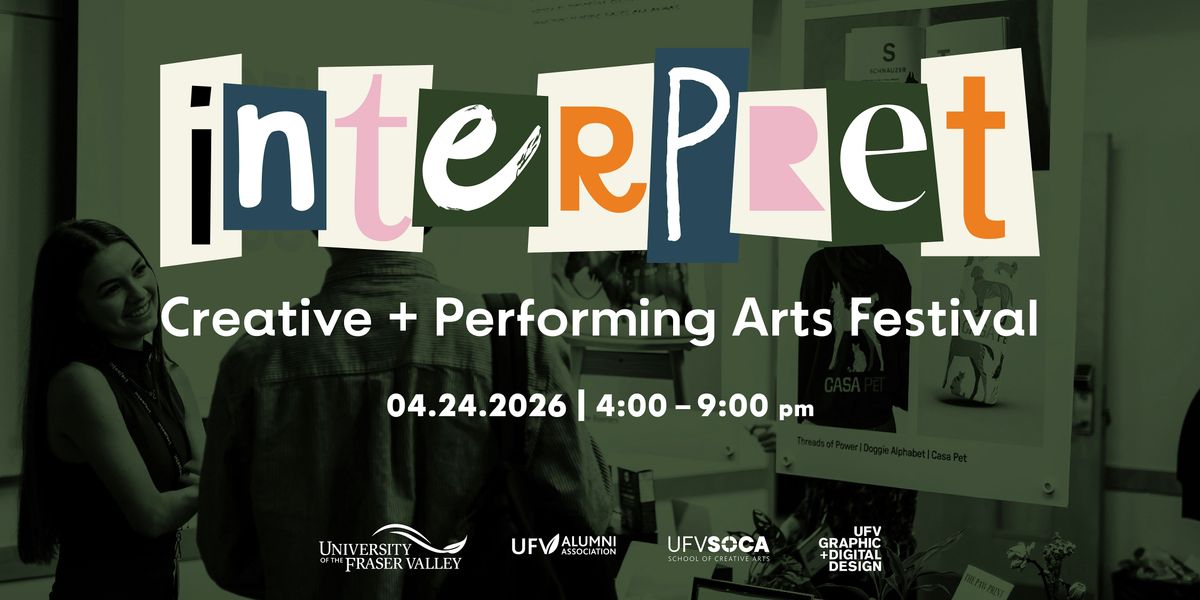 Join us for the seventh annual Interpret Festival, hosted by the UFV School of Creative Arts (SoCA) and Graphic + Digital Design, on April 24, 2026, from 4:00–9:00 PM. Everyone is welcome!