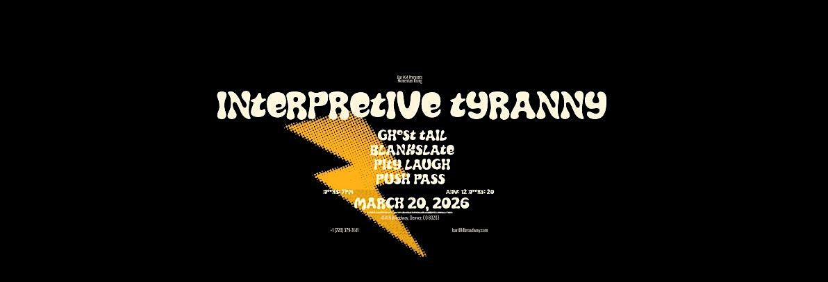 Get ready for a wild night of music and laughs with Interpretive Tyranny, Ghost Tail, Blankslate, Pity Laugh, and Push Pass at Bar 404!
