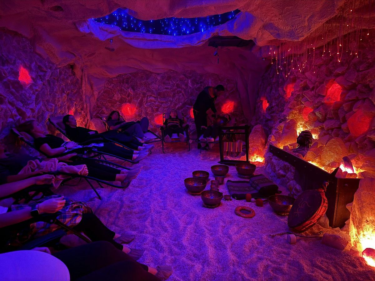 The salt cave provides a natural container for restoration, supporting respiratory health, circulation, immune function, and sleep while helping neutralize stress responses. Within this space, a guided sound bath uses gentle vibration and rhythm to activate the parasympathetic “rest and digest” system, allowing breath to deepen, muscles to soften, and the nervous system to settle. No movement or experience is required; participants are invited simply to rest and receive.