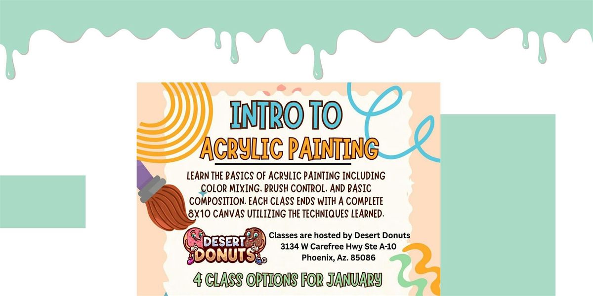 Welcome to Intro to Acrylic Painting! Join us at Desert Donuts on January 24, 2026 at 5:00 PM (Mountain Standard Time) for a fun and creative session. No experience needed, just bring your enthusiasm! Let's unleash our inner artists together. See you there! Oh and each class has been tested and approved for ESA reimbursement. Minimum age is 8 years old to attend. Parent or guardian is required to attend as well. Each attendee will leave with an 8x10 completed canvas. Each class in January is different so that each student may attend one or all four classes at $50 per class.