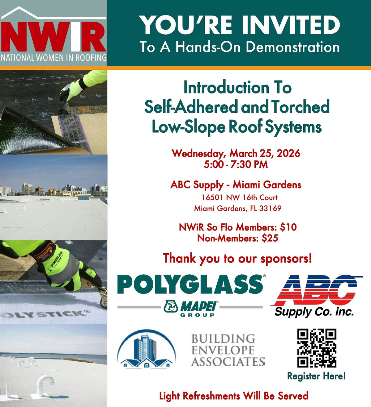 Experience a crash course on SBS/APP modified bitumen roof systems with a hands-on demonstration of self-adhered and torched membranes. Learn proper methods and materials to install the system and details needed to achieve a successful project and a long-lasting roof for your customers. Dinner and refreshments will be provided.