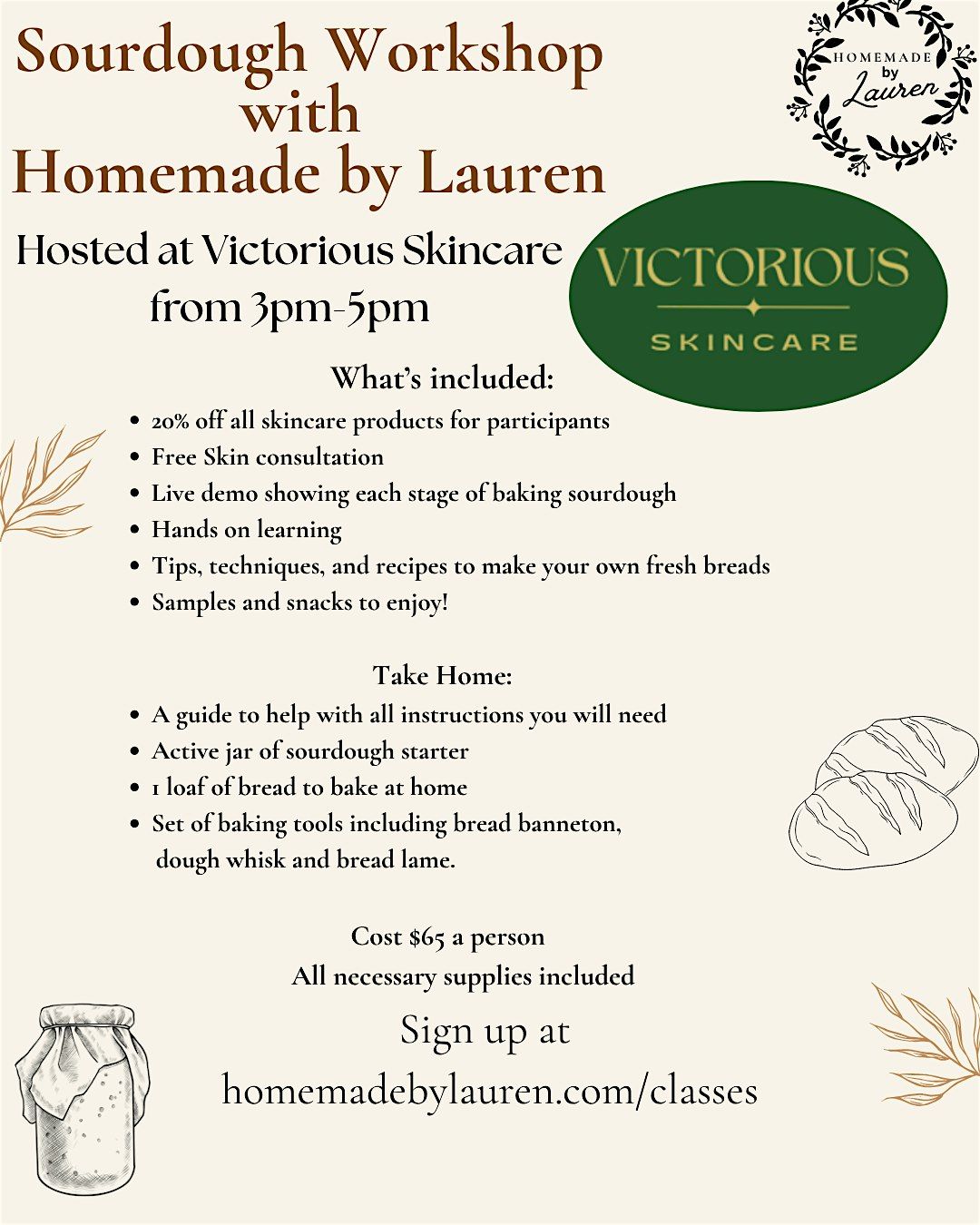 Join us for a fun and interactive Intro to Sourdough Class hosted by Homemade by Lauren and Victorious Skin Care at 907 Barra Row Suite 102.****Participants will also receive 20% off all products as well as a free skin consultation!****