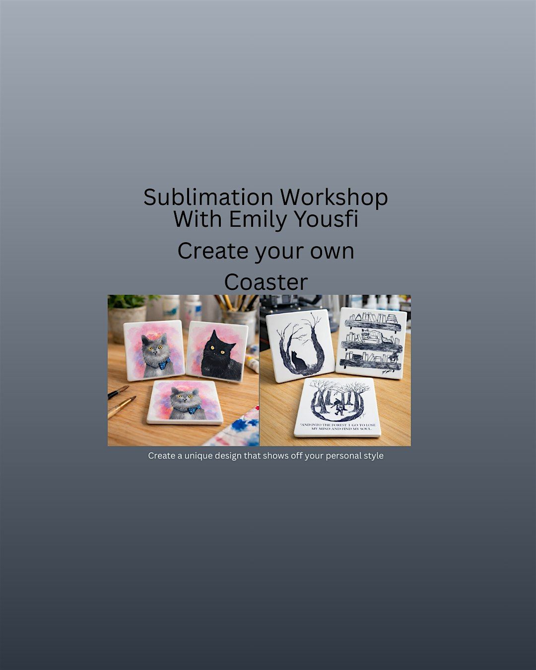 Ready to dive into the world of sublimation? Join us for a fun in-person workshop where you'll learn how to create your very own custom coasters! Emily Yousfi will guide you through the process step-by-step. No experience needed—just bring your creativity and get ready to design some cool, personalized coasters. Don’t miss out on this hands-on, artistic adventure!