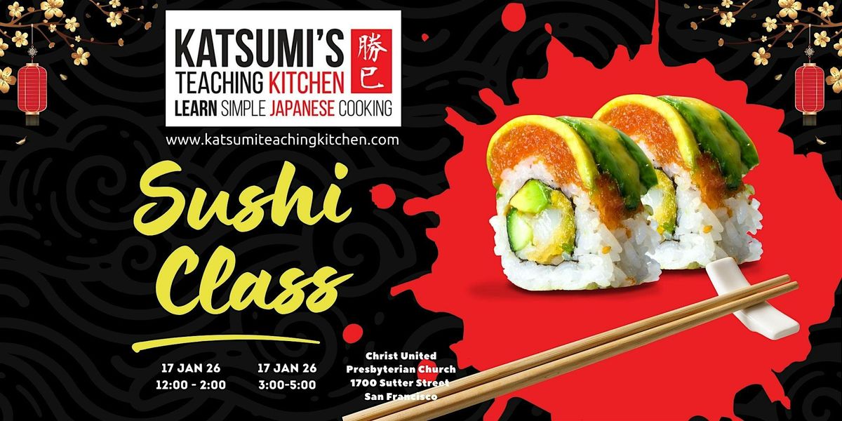 Chopstick skills, Spring rolls, California roll sushi, Tuna sushi, Shrimp sushi, Rice cooker steamed cake, and Tea