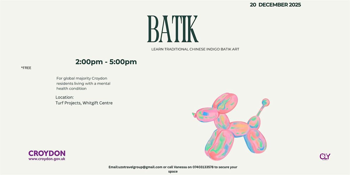 This session will be a relaxed, welcoming introduction to Chinese Batik-style art. We’ll begin by meeting outside the Metro Bank, opposite the Whitgift Centre, before heading to the workshop space together.