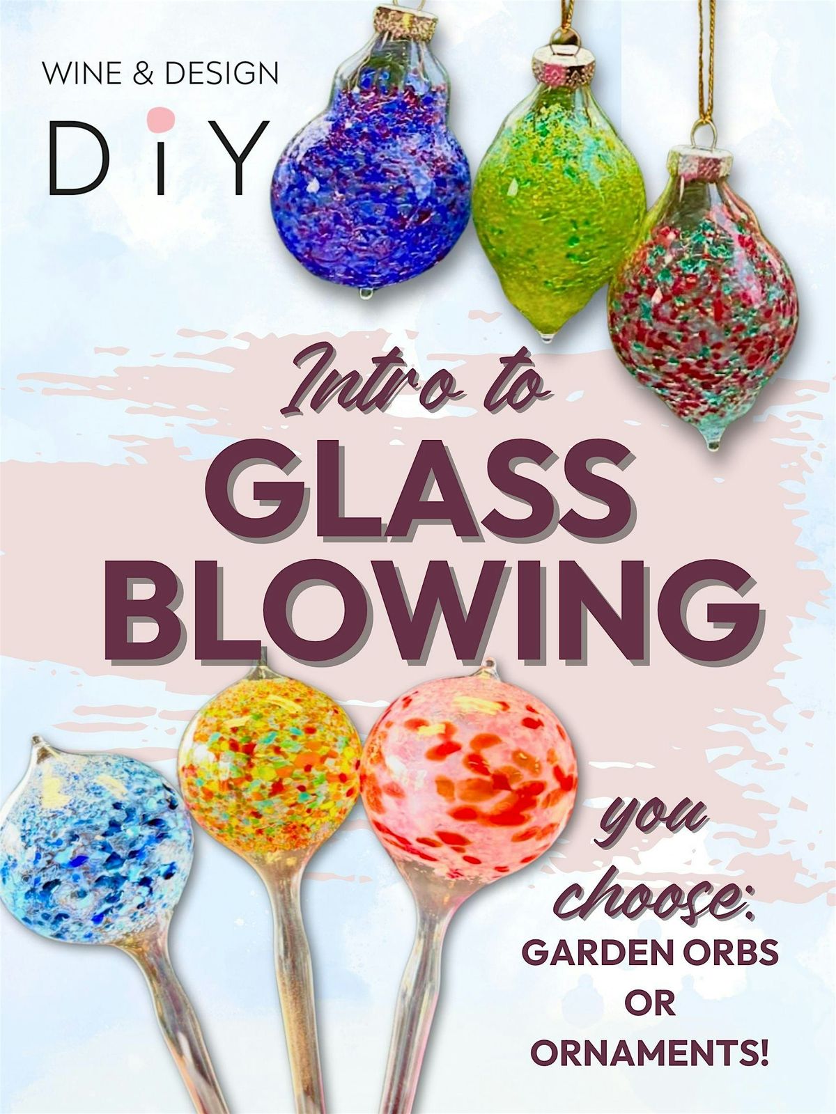We’re bringing the heat—literally! Join us as you get to choose between learning to make 3 decorative glass orbs for your garden or three gorgeous ornaments. In this hands-on class, guests will learn the basics of glass blowing and create three unique blown glass garden orbs. Whether you're a total beginner or just curious about the art form, this workshop is designed to be fun, approachable, and one-of-a-kind! Classes will run back to back, so PLEASE be on time. What to Expect: This is a 1-hour workshop. You’ll spend the first 30 minutes creating your glass ornaments, followed by 30 minutes of relaxing and sipping while your creations cool. Each guest will be provided with the materials to create three garden orbs. Since this is an introductory-level experience, garden orbs will vary in shape and size, and may not be perfectly round—each one is a unique work of art! Important Notes: 18+ ONLY – no exceptions. All participants will be required to sign a liability and safety waiver before the workshop begins. Safety wear is mandatory and will be provided, including safety glasses and gloves. Our instructors will guide you every step of the way to help you create three beautiful ornaments. However, due to the nature of glass blowing, we cannot guarantee all pieces will turn out successfully—and that’s all part of the learning experience!