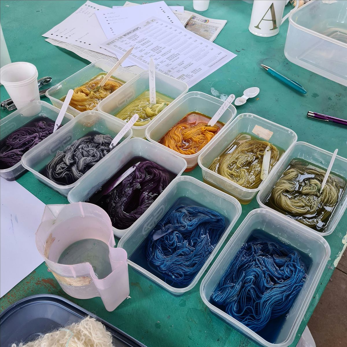 After a short introduction to natural dyeing, where our dyes come from, the difference between raw/dried dyestuffs and natural extracts and so on, you will be creating a fabulous set of samples, taking you through the colours of the rainbow. With your samples you’ll be able to recreate a huge range of colours, all from natural dyes.