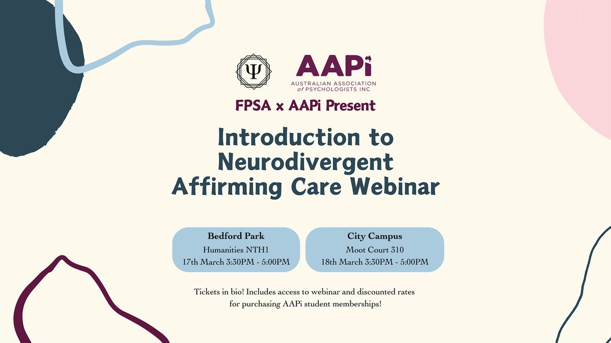 Screening of the 'Introduction to Neurodivergent Affirming Care' webinar created by Australian Association of Psychologists INC (AAPi). Included with this ticket is snacks (like popcorn), drinks, access to the webinar, and opportunity to purchase a discounted student membership with AAPi!