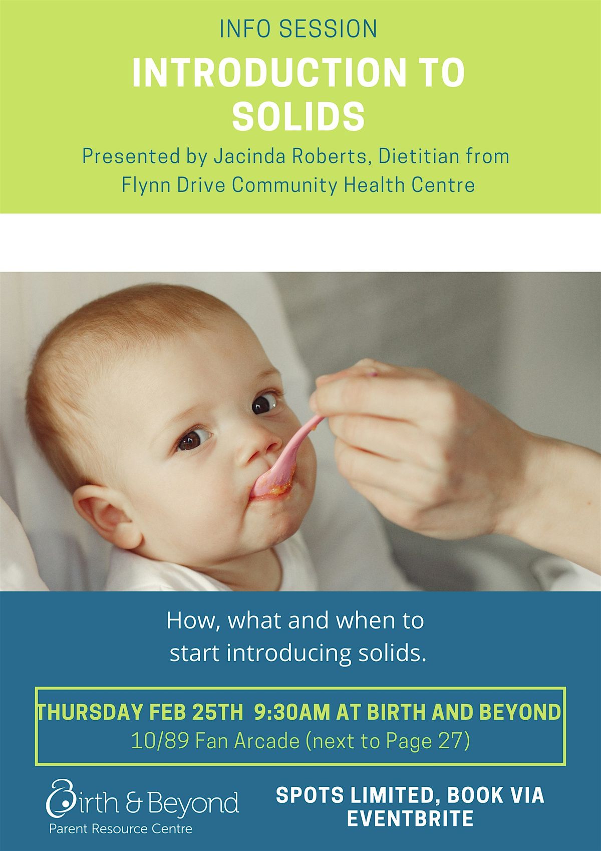 Join one of our local Public Health Nutritionist/Dietitians from Flynn Drive Community Health Centre will answer all your questions on the best ways to introduce your baby to solid food. How old should baby be? Purees or baby-led weaning? What kind of foods are best? It can be a confusing time with so much conflicting information out there so let our local child and family health team show you the way.