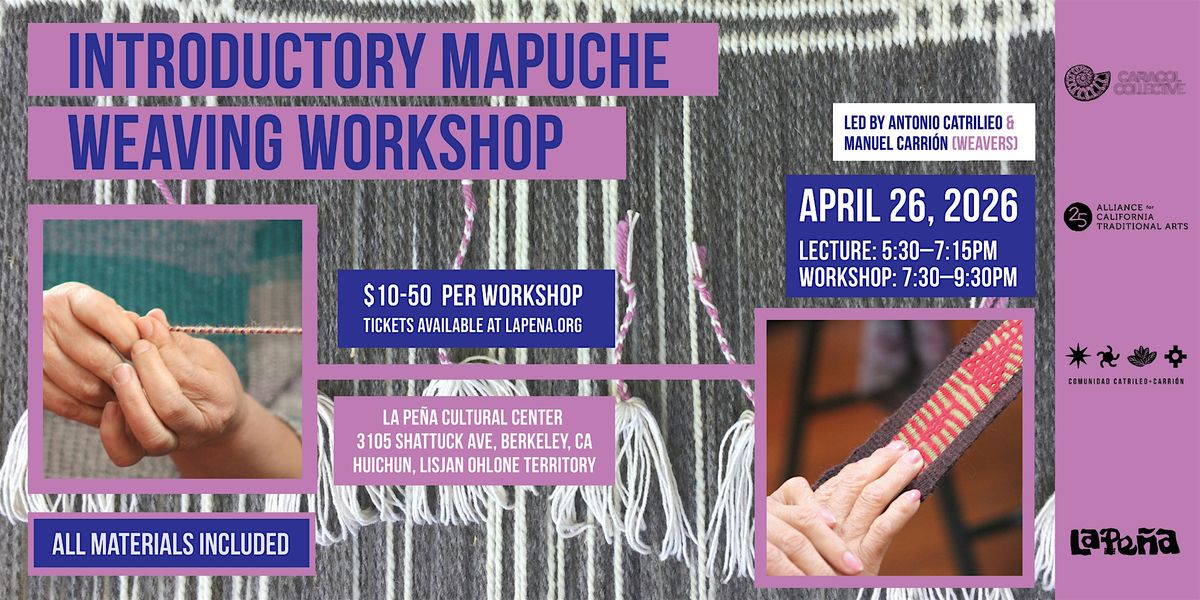 Comunidad Catrileo+Carrión, Caracol Collective & La Peña come together to bring Mapuche weaving kimün (knowledge) to the Bay Area with a FREE lecture and a series of three hands-on weaving workshops –with all materials included!