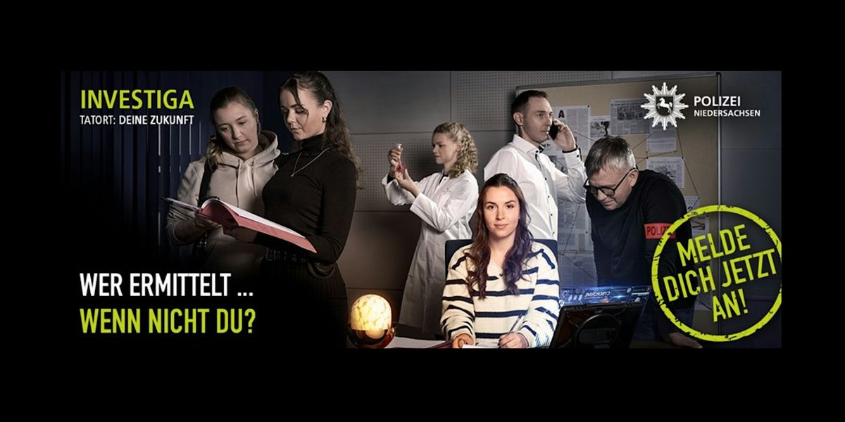 Bist du bereit, die Ermittlungsarbeit der Polizei Niedersachsen hautnah zu erleben? Dann komm unbedingt zur INVESTIGA! Hier bekommst du einen direkten Einblick, wie die Ermittlungsarbeit im Jahre 2026 und zukünftig aussieht, welche Arbeitsbereiche es im Ermittlungsbereich gibt und wo du vielleicht eines Tages selbst arbeiten wirst und deinen Teil dazu beiträgst, die Welt ein Stück weit sicherer zu machen.