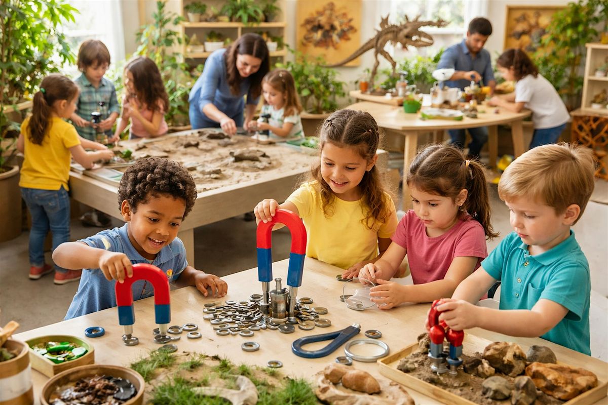 INVESTIGACTIVA es un espacio de ciencia diseñado para dar rienda suelta a la innata capacidad de niñas y niños para preguntar, investigar y descubrir. En esta edición especial exploraremos el magnetismo, el mundo de los dinosaurios y los secretos de la naturaleza en familia. Descripción: Espacio de ciencia orientado a niñas y niños de 2 a 8 años. En este taller daremos rienda suelta a la innata capacidad de los niños y niñas para preguntar, indagar y descubrir. En esta ocasión, el espacio estará especialmente diseñado en torno a tres grandes ejes: los imanes y el magnetismo, los dinosaurios y la exploración de la naturaleza. Los participantes podrán experimentar con materiales magnéticos, observar cómo interactúan los imanes, descubrir fuerzas invisibles y explorar sus aplicaciones. Además, se adentrarán en el mundo de los dinosaurios a través de fósiles, réplicas, clasificaciones y juegos de exploración paleontológica. Todo ello se complementa con propuestas vinculadas a la naturaleza: minerales, restos biológicos, elementos naturales y herramientas de observación. Rampas, lupas, microscopios, mesas de luz, materiales magnéticos, fósiles, esqueletos y colecciones naturales, entre muchos otros recursos, estarán cuidadosamente dispuestos para favorecer una experiencia atractiva, accesible y estimulante. Las propuestas estarán distribuidas por toda la sala y movilizarán contenidos relacionados con la ciencia como el magnetismo, la clasificación de seres vivos, la historia natural, la observación científica y la exploración del entorno.