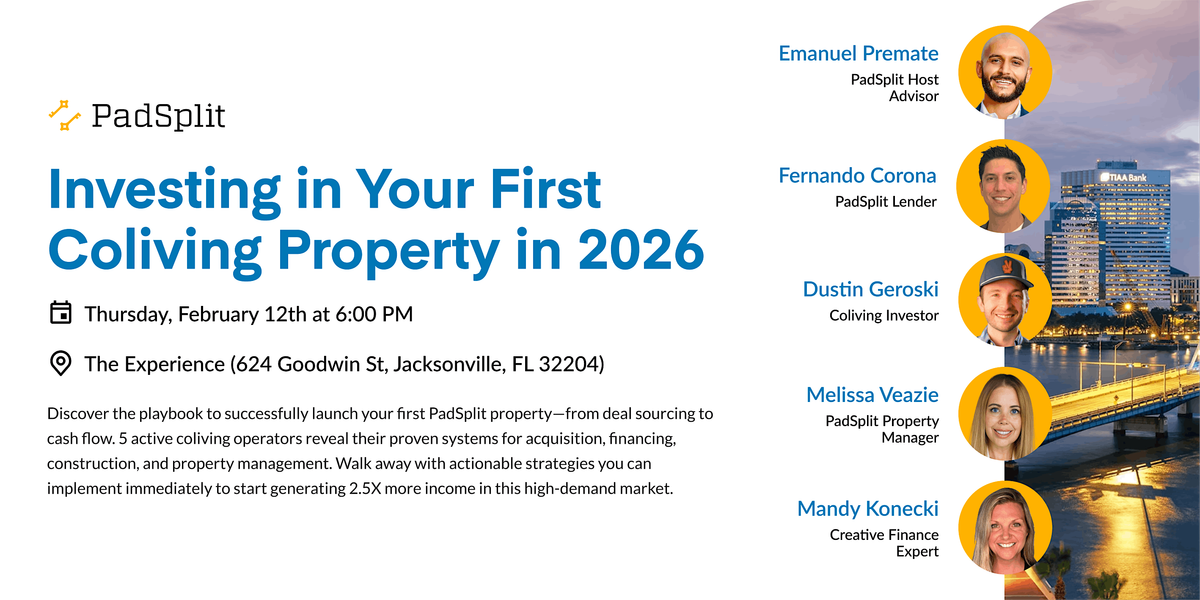Discover the playbook to successfully launch your first PadSplit property—from deal sourcing to cash flow. 5 active coliving operators reveal their proven systems for acquisition, financing, construction, and property management. Walk away with actionable strategies you can implement immediately to start generating 2.5X more income in this high-demand market.