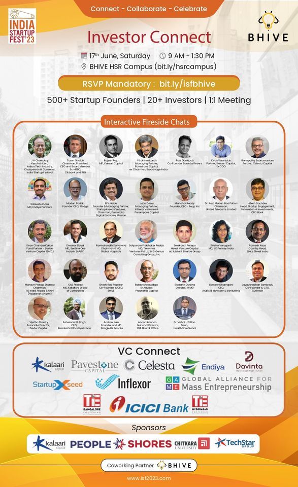 Join us for an exclusive Investor Connect event at BHIVE Workspace HSR Campus, Bengaluru on 17th June! ? ✨ Get ready to meet 500+ investors and connect with 20+ founders in a dynamic networking environment. This is your opportunity to take your startup to new heights and secure valuable partnerships.