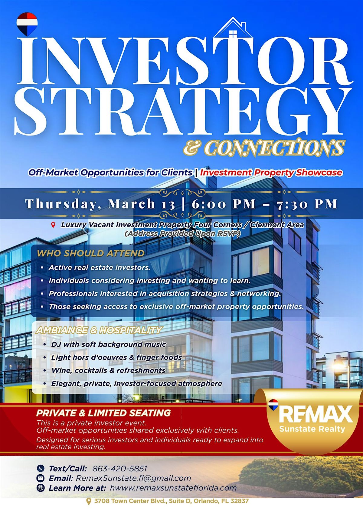 Join RE/MAX Sunstate Realty for a private investor-focused event designed to position you strategically ahead of market timing in Central Florida.