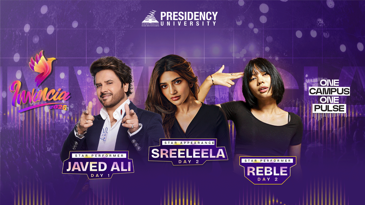 Presidency University`s Flagship Inter-Collegiate Cultural FestivalGet ready for two days of non-stop energy, talent, and celebration!Invicia 2026 is back, bigger and better, bringing together students from across colleges to compete, perform, and create unforgettable memoriesMusic, Dance, Fashion, Art, Film, Theatre, Debate, Esports, Photography, Management EventSpecial Highlight - Pro Night Artist Experience the unstoppable energy and leading artists and performers on stage