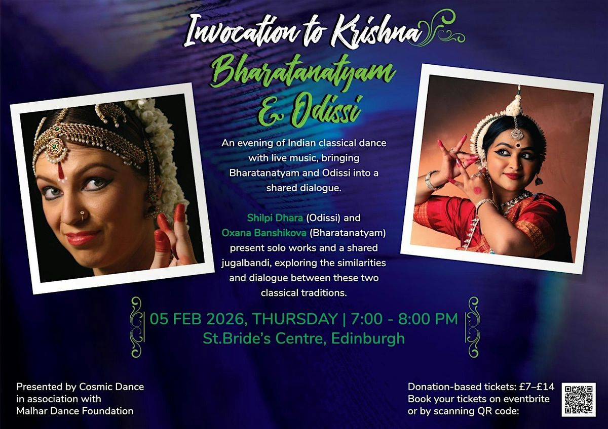 Invocation to Krishna brings together the classical Indian dance traditions of Bharatanatyam and Odissi in an intimate evening of live performance.