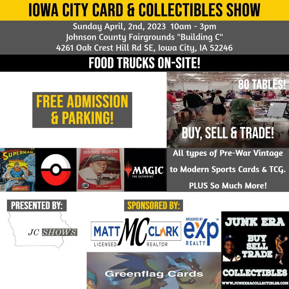 Vendor Table Availability is Limited!This Sunday is the First Spring Card Show in Iowa City! Dealers from Michigan, Illinois, and of course Iowa, will have on display Pokemon & Sports Cards Galore, Weiss Schwarz, Yu-Gi-Oh, Magic The Gathering Cards & other types. Let's not forget about the Toys, Comics, Wildlife Paintings, Iowa Hawks items, Funkos, Funko Gold Vinyl Football Player Figures, Video Games. and other types of collectibles. PLUS So Much More!