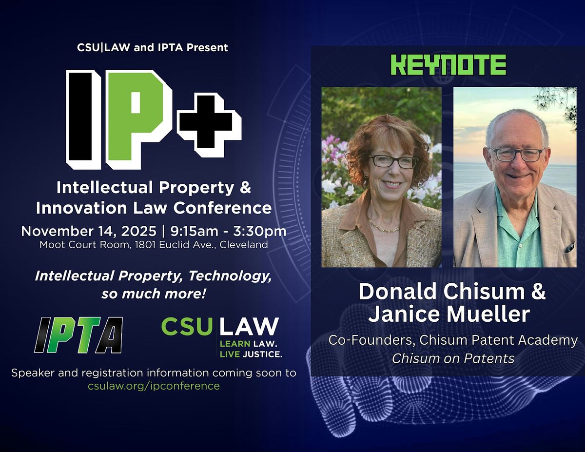 Join us for CSU|LAW’s annual IP+ Conference to learn about updates and insights in intellectual property law, the intersection of IP and medicine, IP and AI, and more. Our keynote speakers will be Donald Chisum (author of Chisum on Patents, the most respected long-standing treatise on U.S. patent law, and co-founder of the Chisum Patent Academy) and Janice Mueller (co-founder of Chisum Patent Academy, former professor, and Patent Law textbook author). Your day will be filled with captivating discussions, insightful presentations, and networking opportunities. Whether you're a seasoned professional or just starting your journey, this conference has valuable content for everyone.