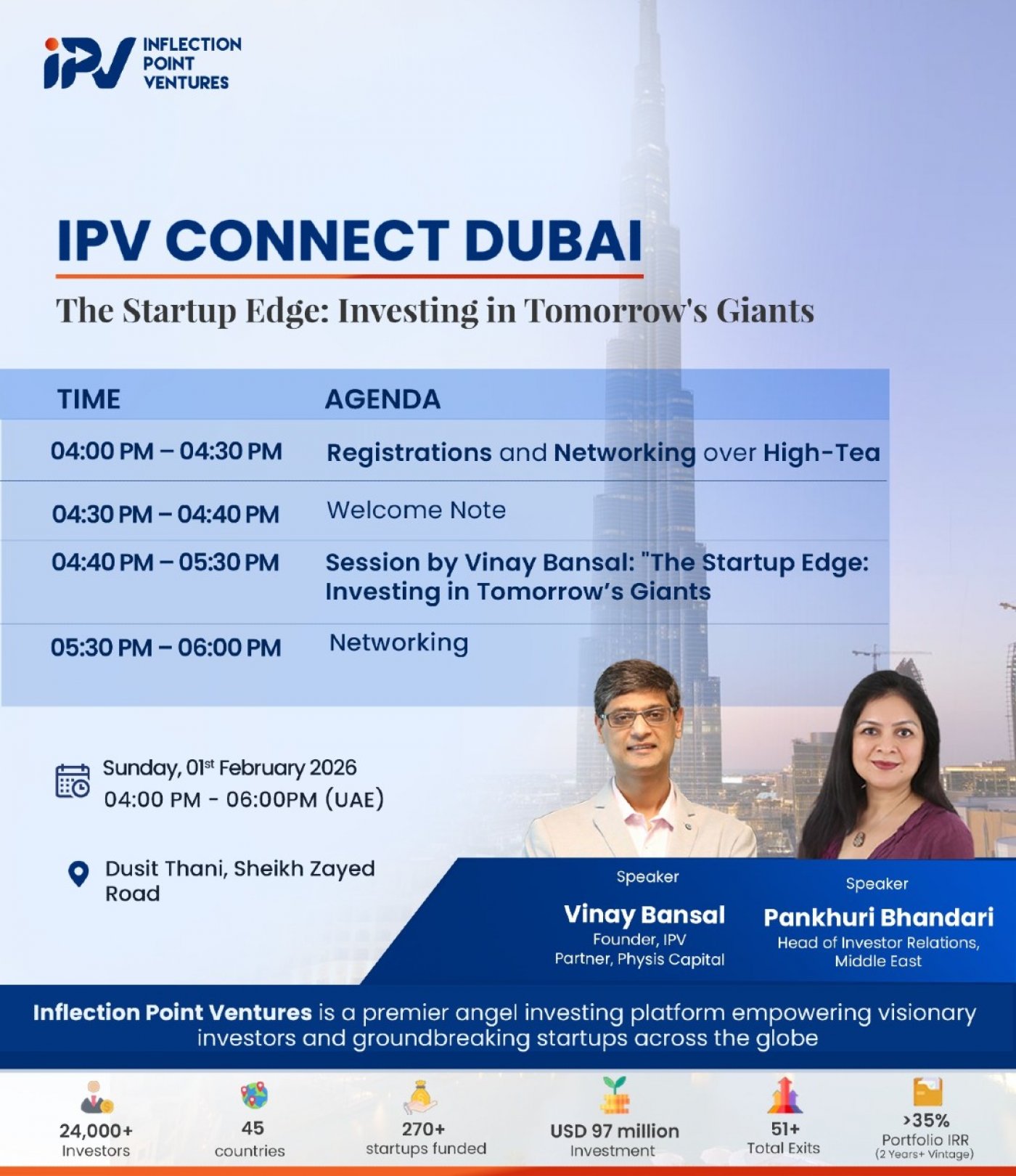 Inflection Point Ventures (IPV), one of India’s leading angel investing platforms, is hosting an exclusive Networking & Learning Evening in Dubai, and we would be glad to have you join us.