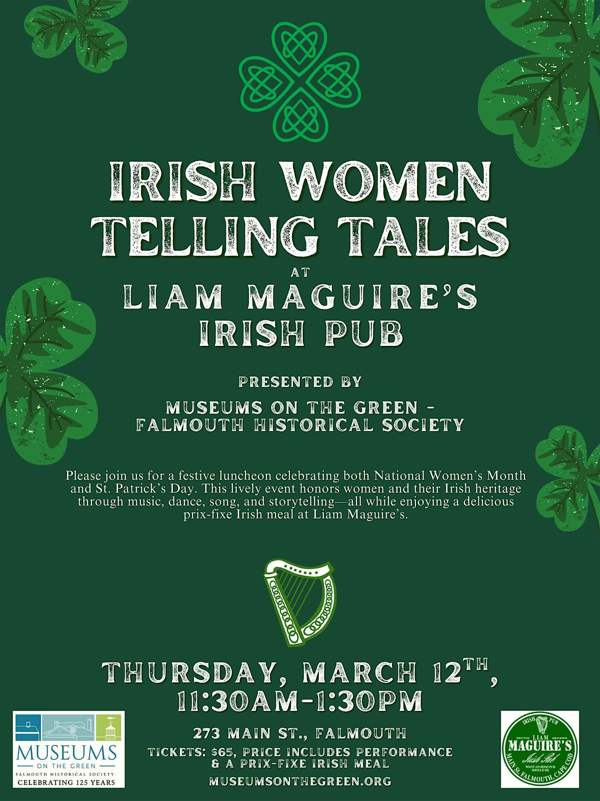 Please join us for a festive luncheon celebrating both National Women’s Month and St. Patrick’s Day at Irish Women Telling Tales. This lively event honors women and their Irish heritage through music, dance, song, and storytelling—all while enjoying a delicious prix-fixe Irish meal at Liam Maguire’s.