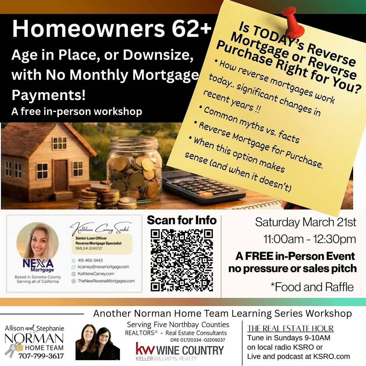 Homeowners 62+ May be able to Age in Place, or Downsize, with No Monthly Mortgage Payments. Access equity to fund everyday expenses, travel, repairs, medical expenses, etc! This is a FREE, no sales pitch, no pressure, in-person workshop.