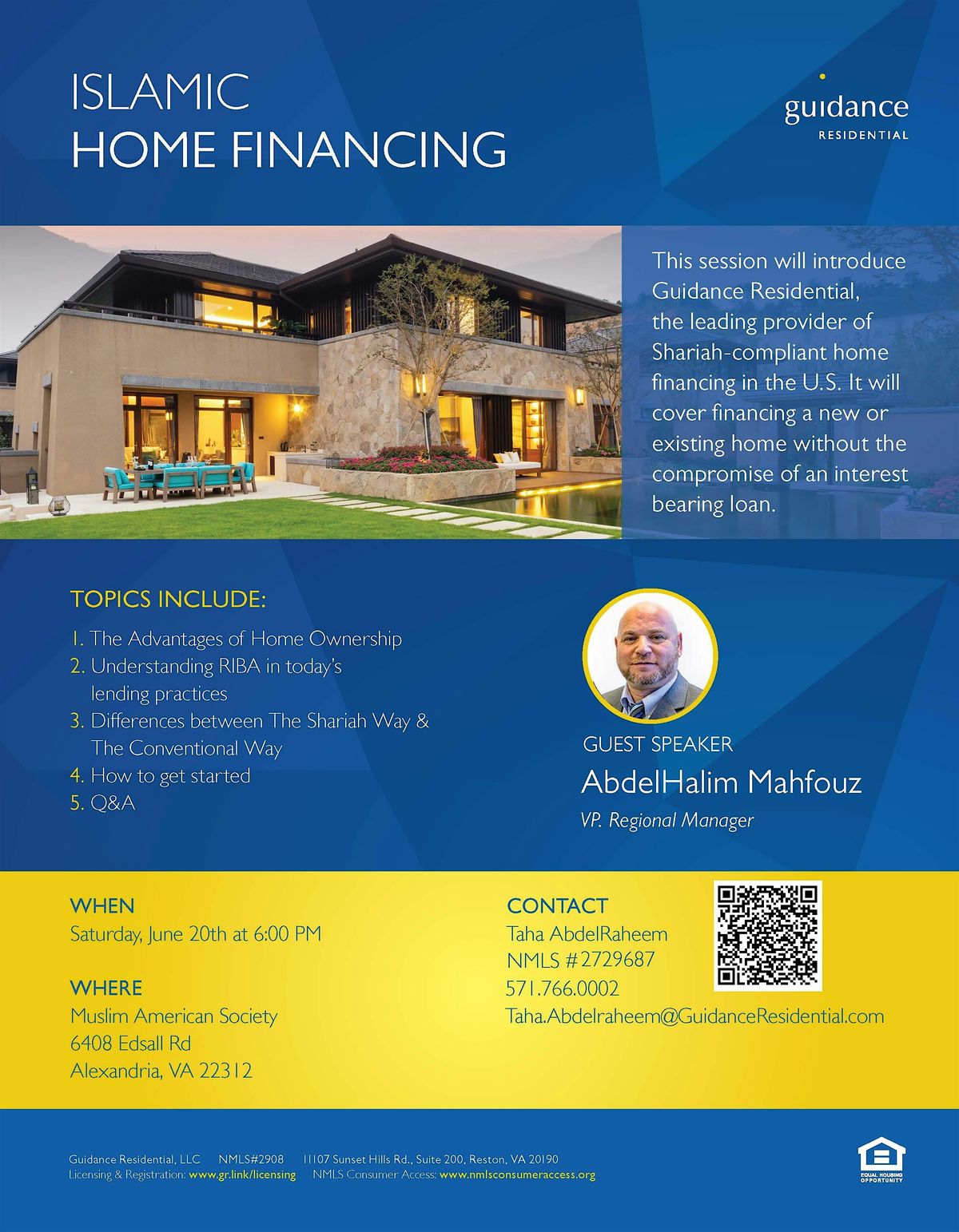 Please join us for an informative presentation introducing Guidance Residential, the leading provider of Shariah-compliant home financing in the United States. This meeting will cover the essential information needed to understand how Guidance Residential can help consumers finance or refinance a home without an interest-bearing loan. We look forward to seeing you there!