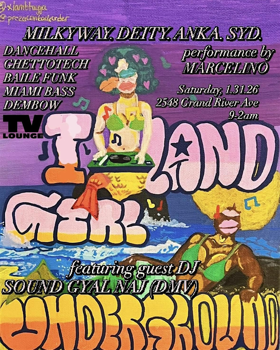 Welcome to Island Girl Underground where Ghettotech meets Baile Funk and Jersey Club meets Dembow. A space where the feminine takes over and is free to express herself through movement and sound. A 5 hour experience featuring an all femme line up full of bad gyal selektasss + a performance. Be lured into the ocean and swim away on Saturday, January 31st, at TV Lounge from 9-2am. All identities welcome.