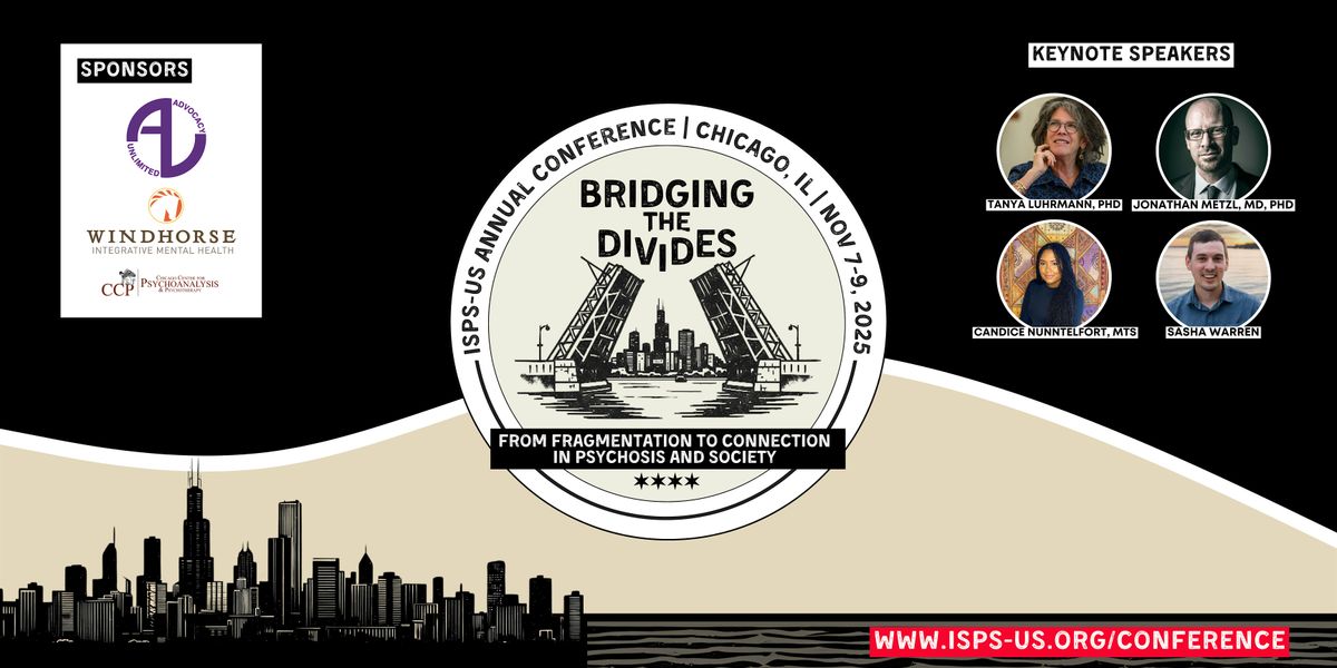 The ISPS-US 24th Annual Conference will offer an opportunity to hold these responses together in community, and to explore ways to address and transcend their interlocking reverberations in psyche, family, and society. Through dialogue, collaboration, and advocacy, we will work to bridge the gaps between perspectives, disciplines, and lived realities in psychosis care and beyond.