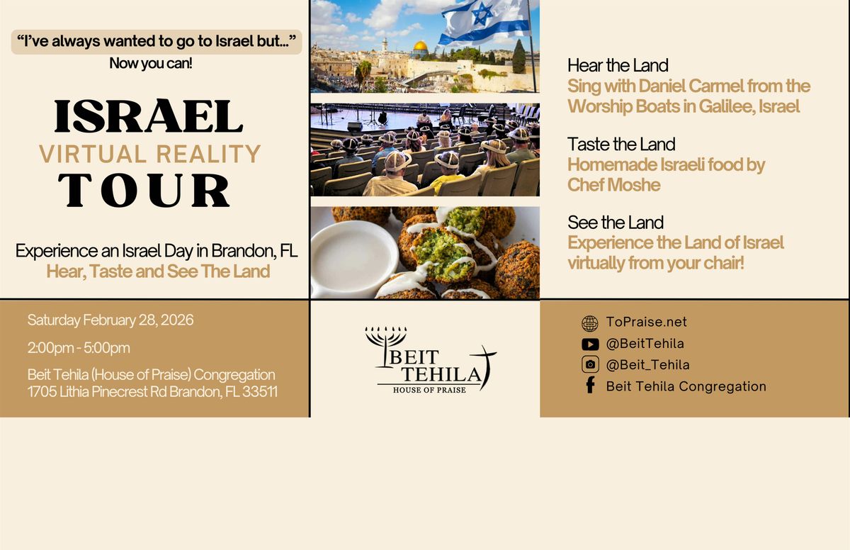 Come experience the Land of Israel with your senses in a scheduled Virtual Reality Tour on February 28th, 2026. This will be an immersive encounter as we bring the Holy Land directly to you. With VR headsets, you will feel like you are in the Land of Israel experiencing the breathtaking views as if you were physically there. During this experience, you will: