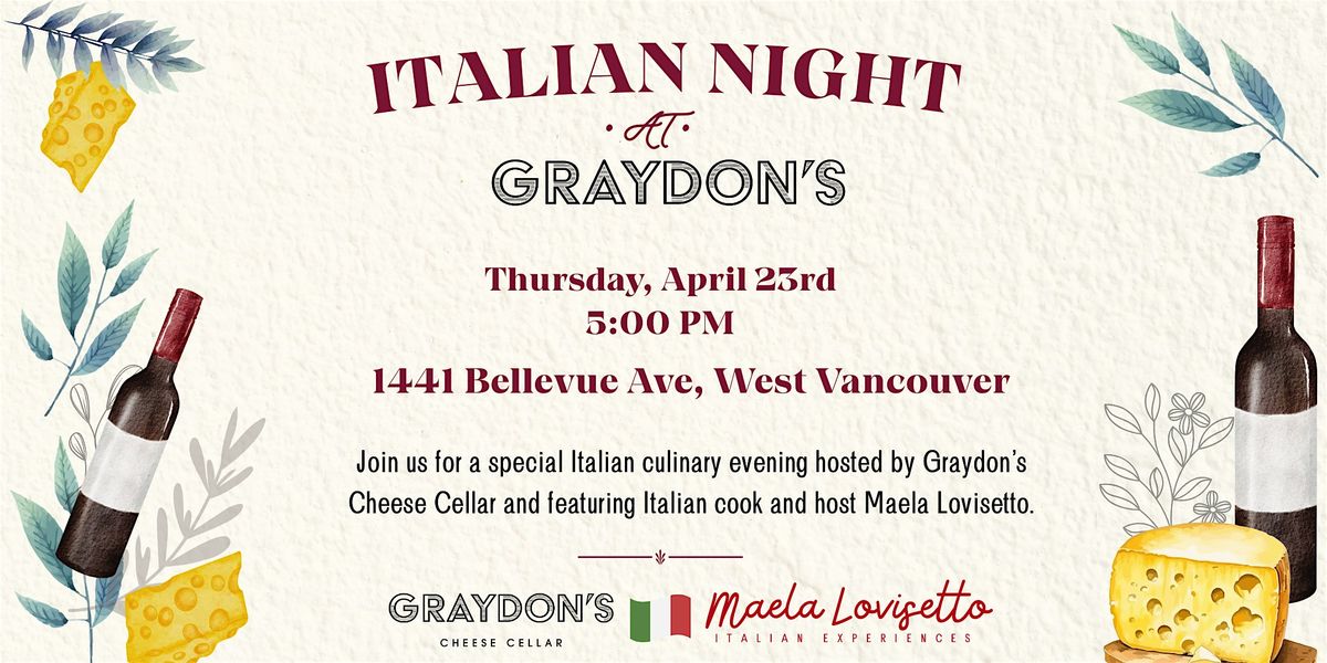 Join us at Graydon's Cheese Cellar for an intimate evening celebrating authentic Italian flavours, exceptional cheeses, and the warmth of Italian hospitality.