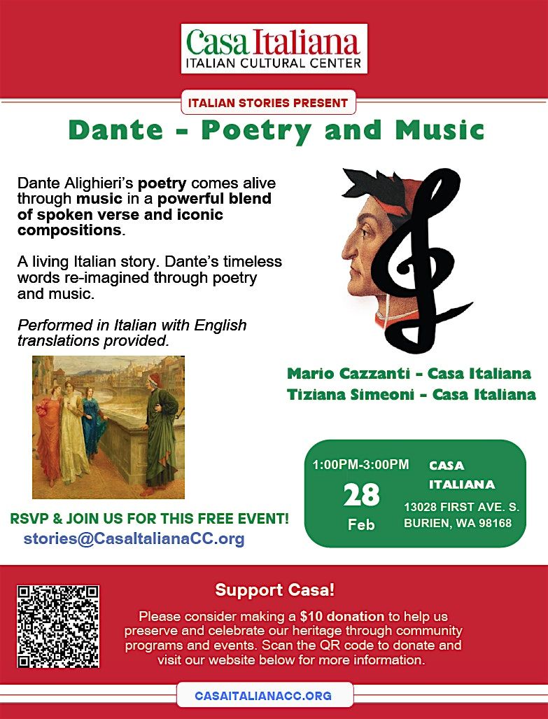 Spoken poetry is woven with masterpieces by Puccini, Verdi, Battiato, and Leonard Cohen, creating a dialogue between literature and sound. Originally conceived in Italy and first presented in Seattle in 2023, this inclusive event is now hosted at Casa Italiana with Mario Cazzanti and Tiziana Simeoni.