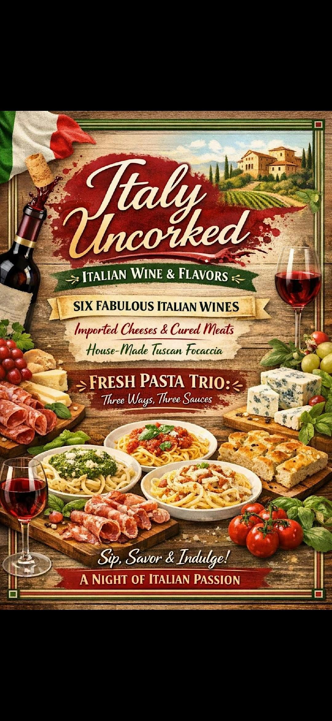 Six fabulous Italian wines, imported cheeses and cured meats, house made Tuscan Focaccia, fresh pasta trio! Sip, savor, indulge!