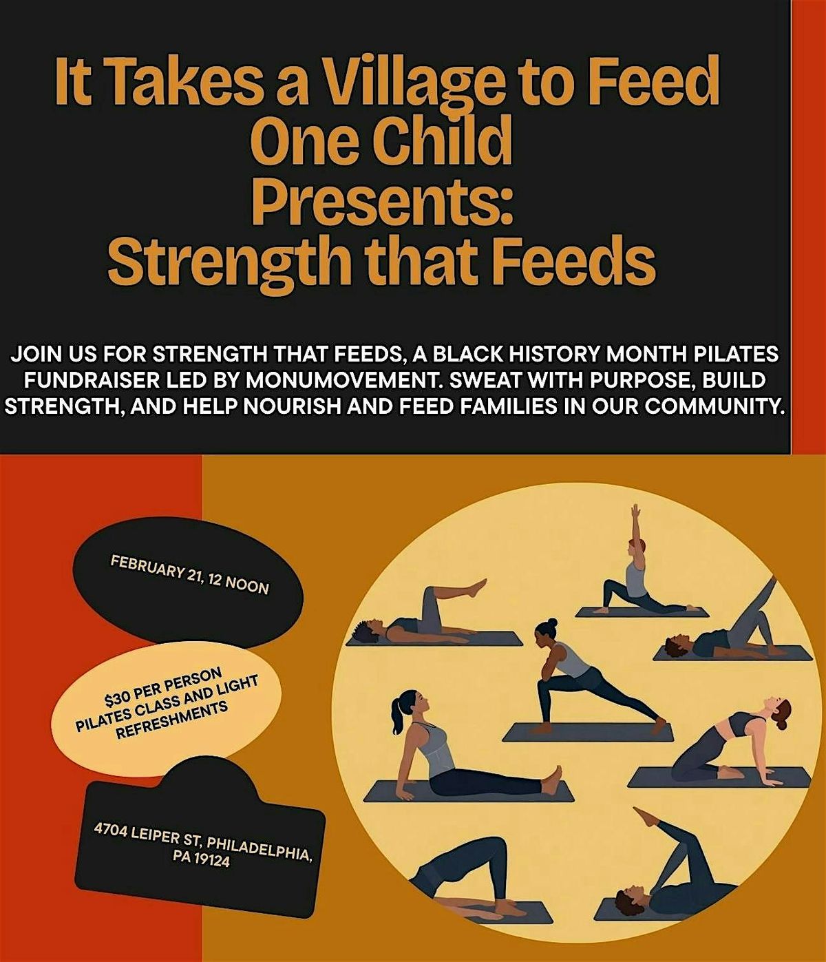 Join us for Strength That Feeds, a Black History Month Pilates fundraiser led by MonuMovement. Sweat with purpose, build strength, and help nourish and feed families in our community. All men, women, ages, and levels are welcome.