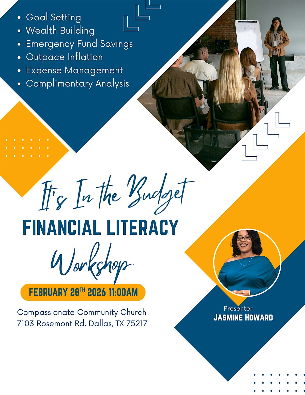 Welcome to It's In the Budget event happening at Compassionate Community Church DTX on February 28, 2026 at 11:00 AM (Central Time). Join us for a fun-filled day of budgeting tips, financial advice, and interactive workshops to help you manage your finances better. Whether you're a budgeting pro or just starting out, this event is perfect for anyone looking to improve their financial literacy. Don't miss out on this opportunity to learn and grow! See you there!