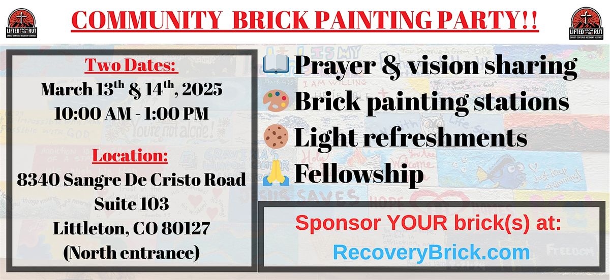 Join us for the Be Part of the Wall of Hope Community Brick Painting Party at LFTR Christian Rehab Services | Drug & Alcohol Treatment! Let's come together to paint bricks and create a beautiful wall of hope for our community. This in-person event is a great way to get involved and make a difference. Bring your friends and family for a day of creativity and community spirit. See you there!