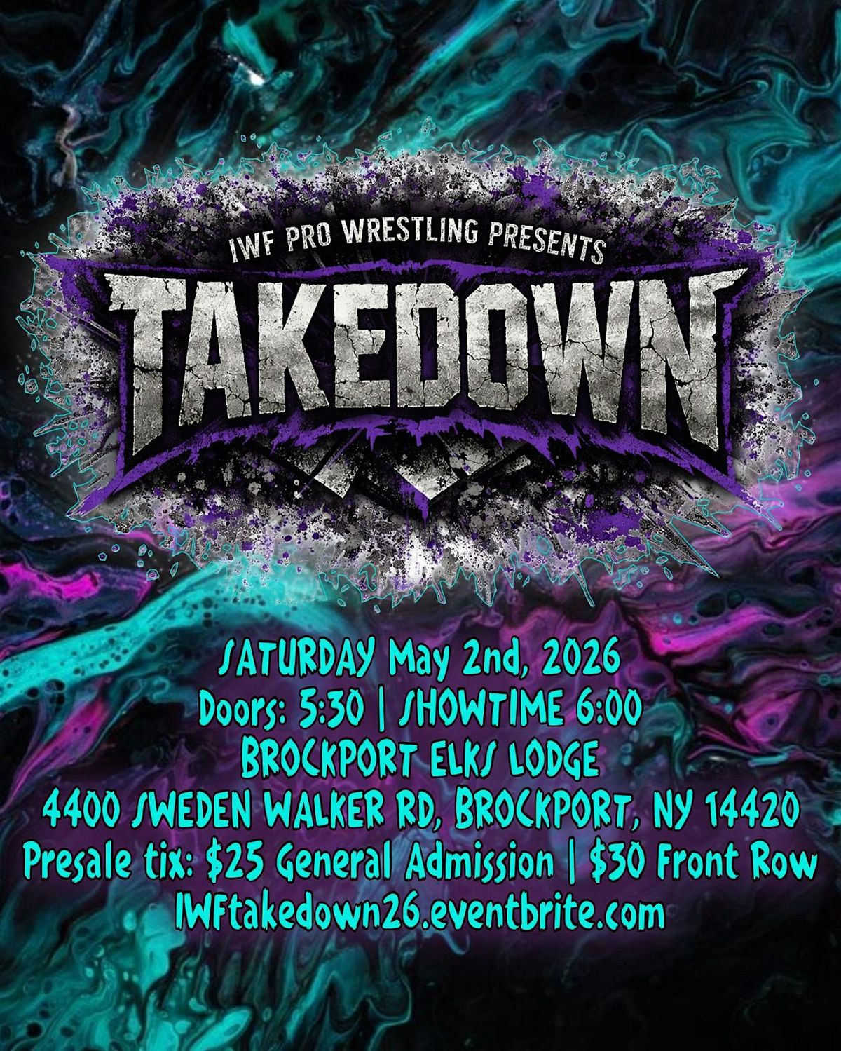 IWF is back Saturday 5/2/26 at the Brockport Elks Lodge w/ TAKEDOWN. SPECIAL GUEST KON! Doors 530 | Show 6. Presale: $25 GA, $30 Front Row.About this Event