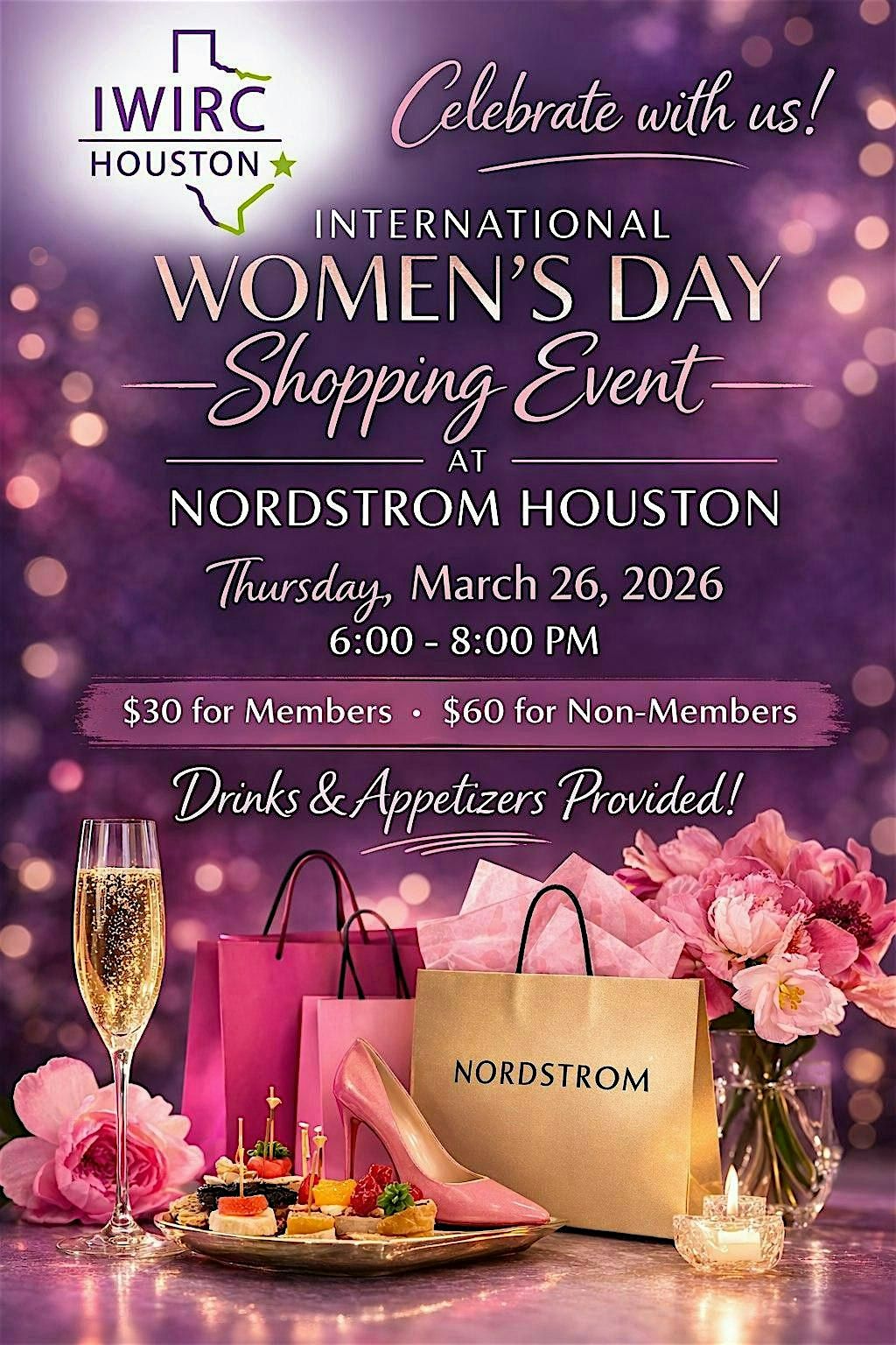 Get ready for a fun-filled evening at the IWIRC Houston Shopping Event! Join us in person to celebrate International Women's Day and explore awesome finds while connecting with fellow IWIRC members! Drinks and light bites will be provided!