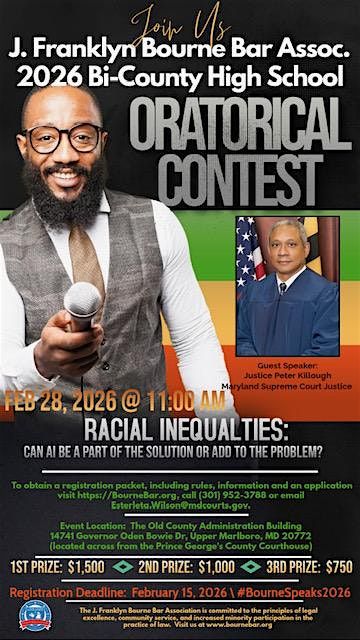 Participants may register and/or share information regarding the rules, an application and information sheet by visiting thebournebar.org or reaching out to Esterleta Wilson at [email protected]/(301) 952-3788. This is all the information needed to join us for an afternoon of thought-provoking orations, black history trivia, prizes, light refreshments and more! We can’t wait to hear from your students! One last thing -- Don’t forget to use our Hashtag: #BourneSpeaks2026 to share preparations for and the actual day’s event with all of your co-workers, colleagues, family, co-workers and friends.