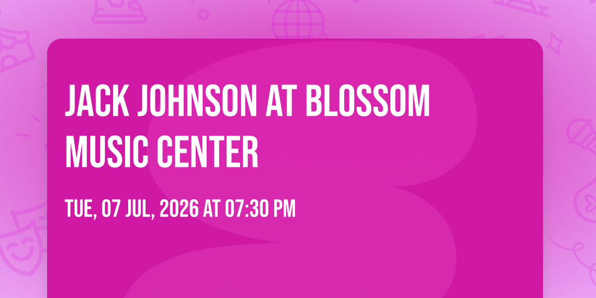 π Be part of history at Jack Johnson at Blossom Music Center, an extraordinary gathering that will captivate your imagination! ποΈ The prestigious Blossom Music Center in Cuyahoga Falls, OH sets the stage for an unforgettable experience on July 7th, 2026 at 07:30 PM. β¨ They are bringing together the finest elements of entertainment and innovation to create moments that will take your breath away. From the moment you arrive, you'll be immersed in an atmosphere of wonder and excitement. π― This carefully planned event ensures every guest experiences something truly special. π Early booking is recommended for this must-attend event of the season!