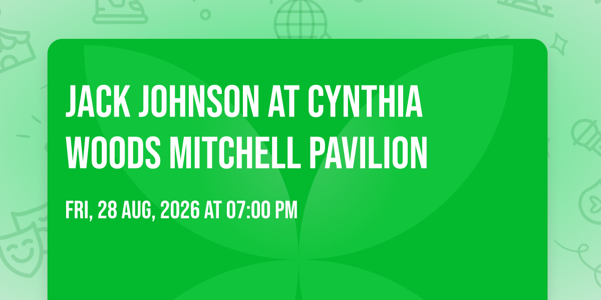 π Welcome to Jack Johnson at Cynthia Woods Mitchell Pavilion, where the impossible becomes possible and dreams take flight! ποΈ Join us at Cynthia Woods Mitchell Pavilion in the heart of The Woodlands, TX for an event that will redefine your expectations. π On August 28th, 2026 at 07:00 PM, witness the transformation of space and time into something truly magical. β¨ It's a curated experience combining the best of innovation, entertainment, and community spirit, creating moments that will be remembered for years to come. Whether you're a first-time visitor or a seasoned enthusiast, prepare to be amazed. π Book now to ensure your place in this unforgettable experience!