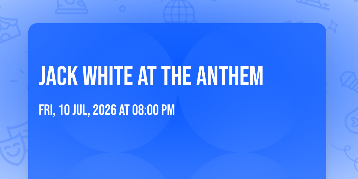 π Welcome to Jack White at The Anthem, where the impossible becomes possible and dreams take flight! ποΈ Join us at The Anthem in the heart of Washington, DC for an event that will redefine your expectations. π On July 10th, 2026 at 08:00 PM, witness the transformation of space and time into something truly magical. β¨ It's a curated experience combining the best of innovation, entertainment, and community spirit, creating moments that will be remembered for years to come. Whether you're a first-time visitor or a seasoned enthusiast, prepare to be amazed. π Book now to ensure your place in this unforgettable experience!