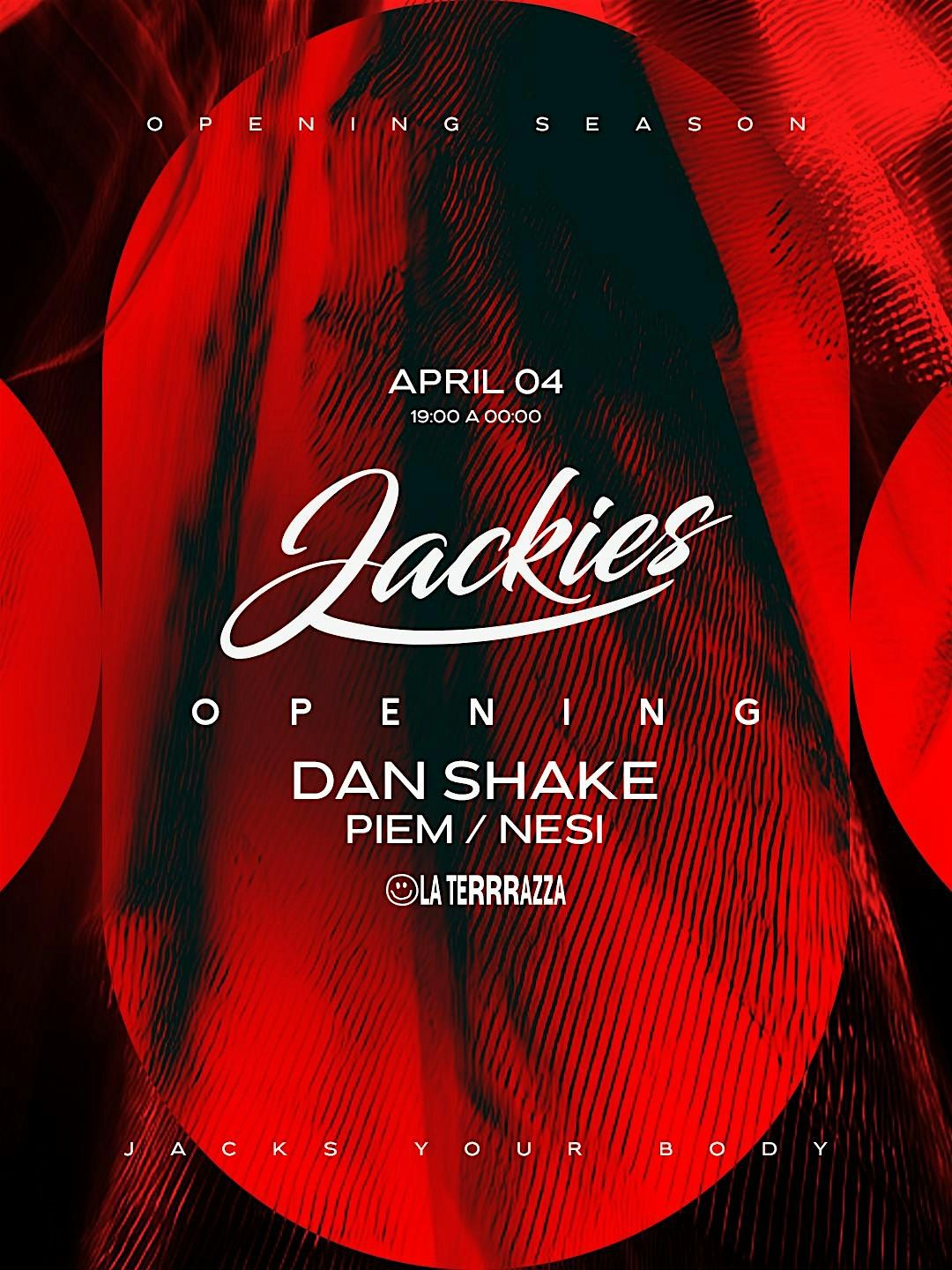 (ESP) 4 de abril save the date! JACKIES regresa a La Terrrazza, vuelven las #openair parties en nuestra casa de Barcelona, en nuestro espacio favorito en el corazón del Poble Español. El opening party siempre es una fecha muy especial, donde nos reunimos tod@s los amantes del House Music, para dar la bienvenida a la primavera, al buen tiempo y a los rayos de sol. Esto será un evento #soldout, no esperéis último momento.